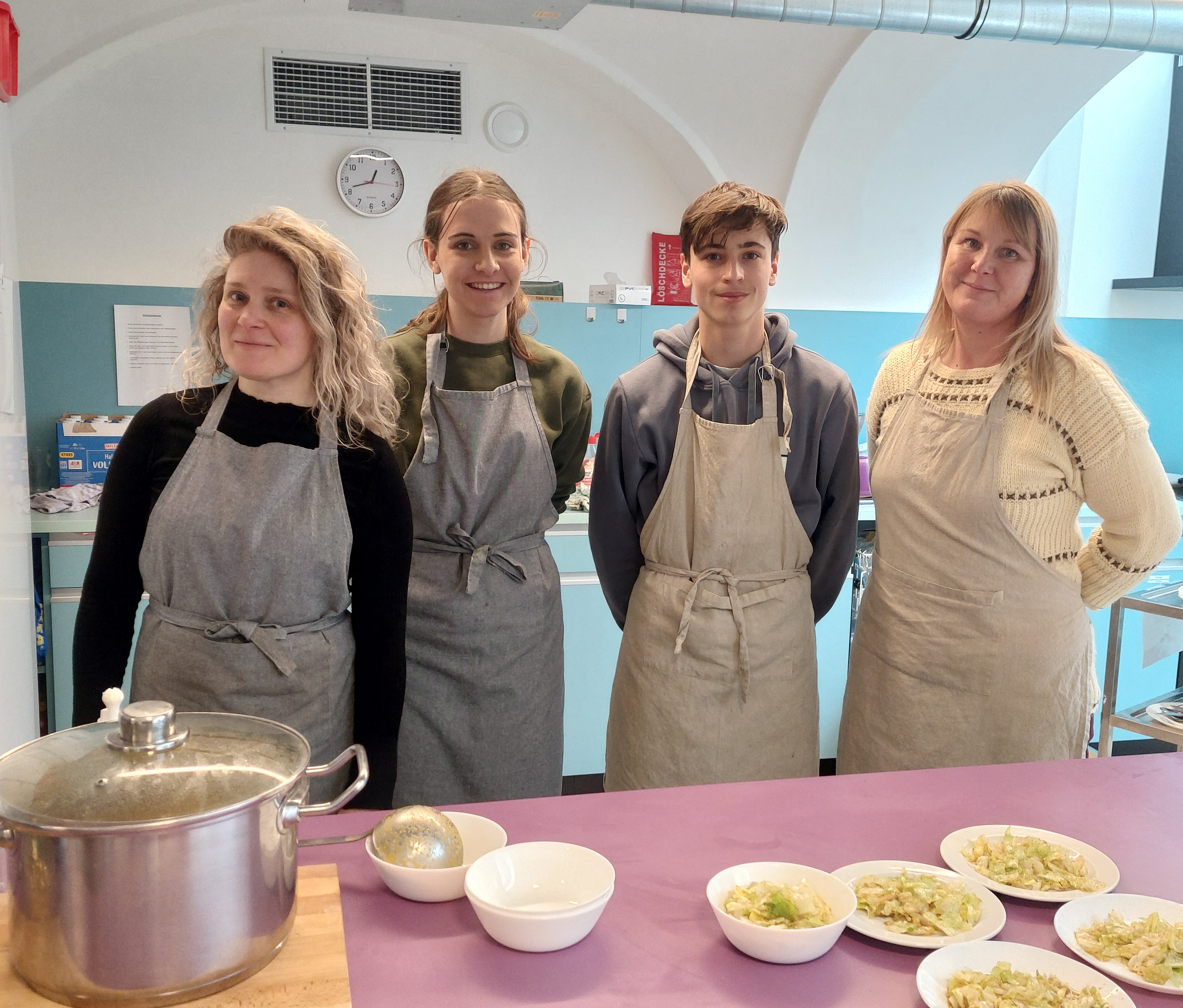 Herzlich Dank an Louisa Aitzetmüller und Johannes Riener, Schüler:innen des BG Gmunden, die an zwei Freitagen im Tageszentrum gearbeitet haben. Außerdem haben sie haltbare Lebensmittel für Mosaik-Klient:innen gesammelt (am Bild mit Ursula und Daniela vom TZ-Team).