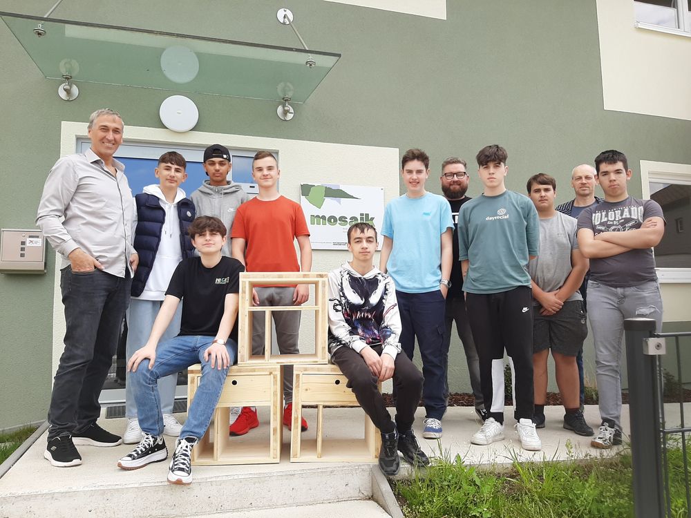 Foto (Mosaik): Die Schüler*innen der Holzbaugruppe des PTS Schwanenstadt übergaben der Notschlafstelle des „Mosaik“ die von ihnen hergestellten Multimöbel