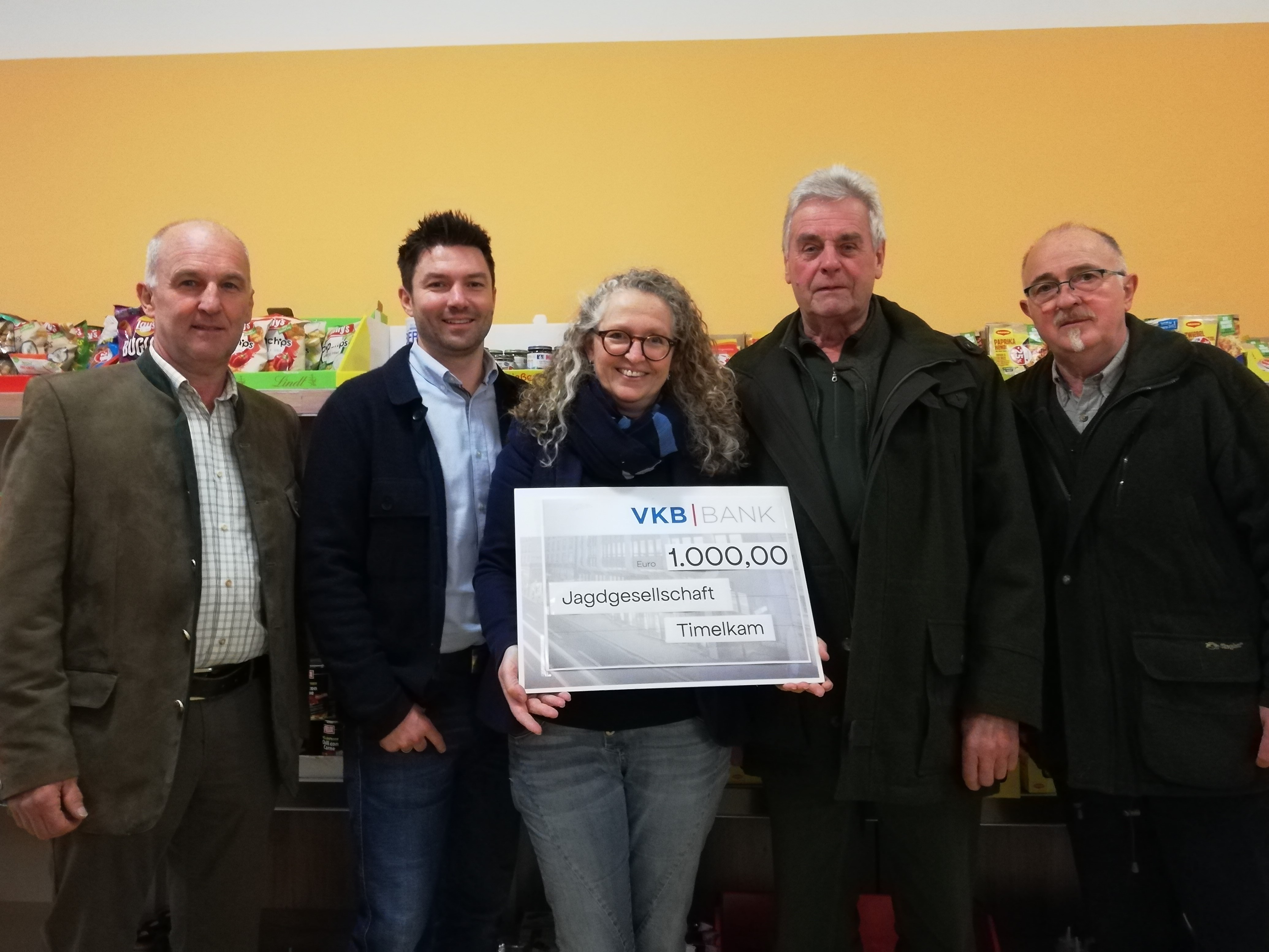 Die Jägerschaft Timelkam unterstützt bereits zum wiederholten Mal den Korb. "Wir sind davon überzeugt, dass unsere Spende hier gut investiert ist", bestätigt uns der Jagdleiter. Mit der Spende von 1.000,00 können wir 100 Lebensmittelpakete, gefüllt mit den Milch, Mehl, Eiern, Zucker, Nudeln und Reis, schnüren. (v.l.n.r: Josef Huemer, Christoph Schuster, Gabriele Brandstetter, Erwin Starlinger, Gerhard Stix)