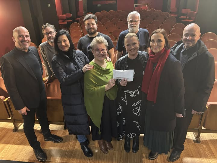 (am Bild: die Musiker:innen mit Claudia Heitzinger von der Kellerbühne und Gerlinde Mayer vom Vorstand des Vereines Sozialzentrum)