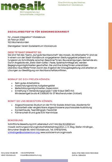 mosaik-wohnungssicherung/notschlafstelle/integration, z. H. Mag. Stefan Hindinger, Gmundner Straße 69, 4840 Vöcklabruck, Tel. 07672/75145, s.hindinger@sozialzentrum.org, www.sozialzentrum.org/mosaik