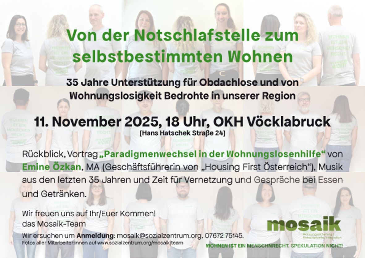 Wir freuen uns auf Ihr/Euer Kommen! Wir ersuchen um Anmeldung: mosaik@sozialzentrum.org, 07672 75145.